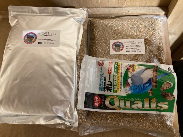 ボレー粉はいろいろなメーカーから販売されていますが、口コミなどを見て体の小さなウズラでも食べやすい、なるべく小さく砕かれた上記のクオリスのボレー粉を選んで与えました。