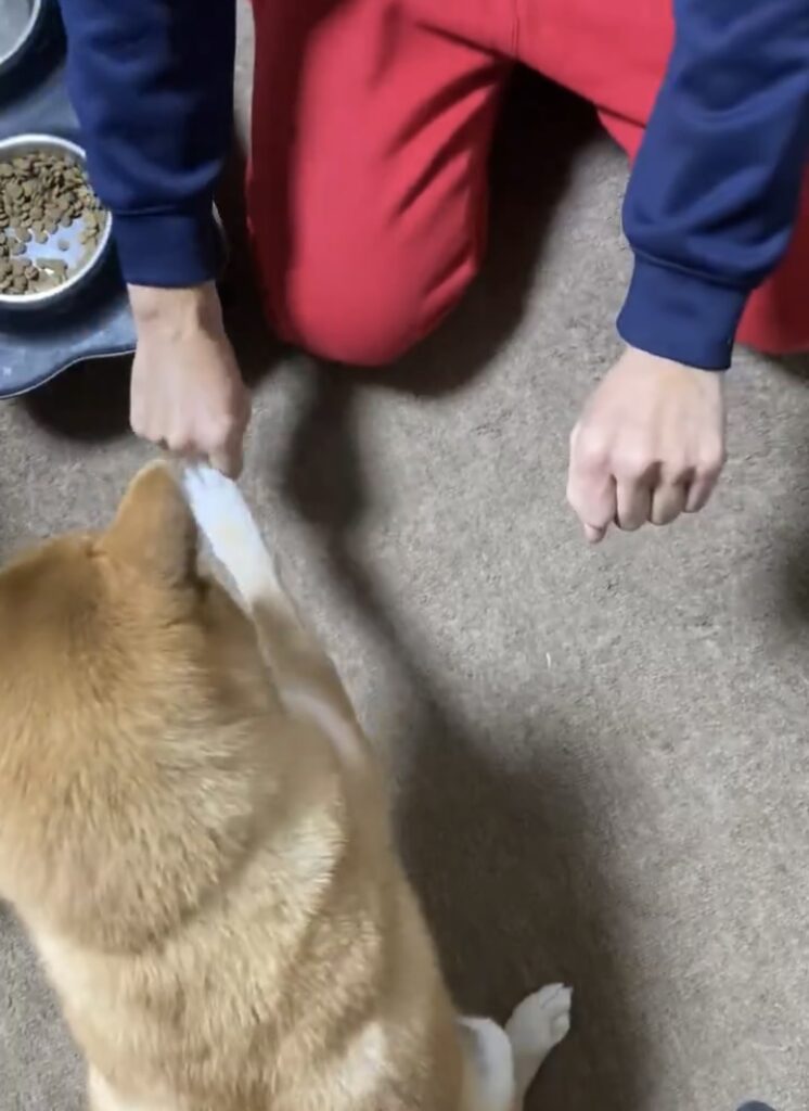 まず、飼い主が片方の手にドッグフードを数粒入れて握ります。